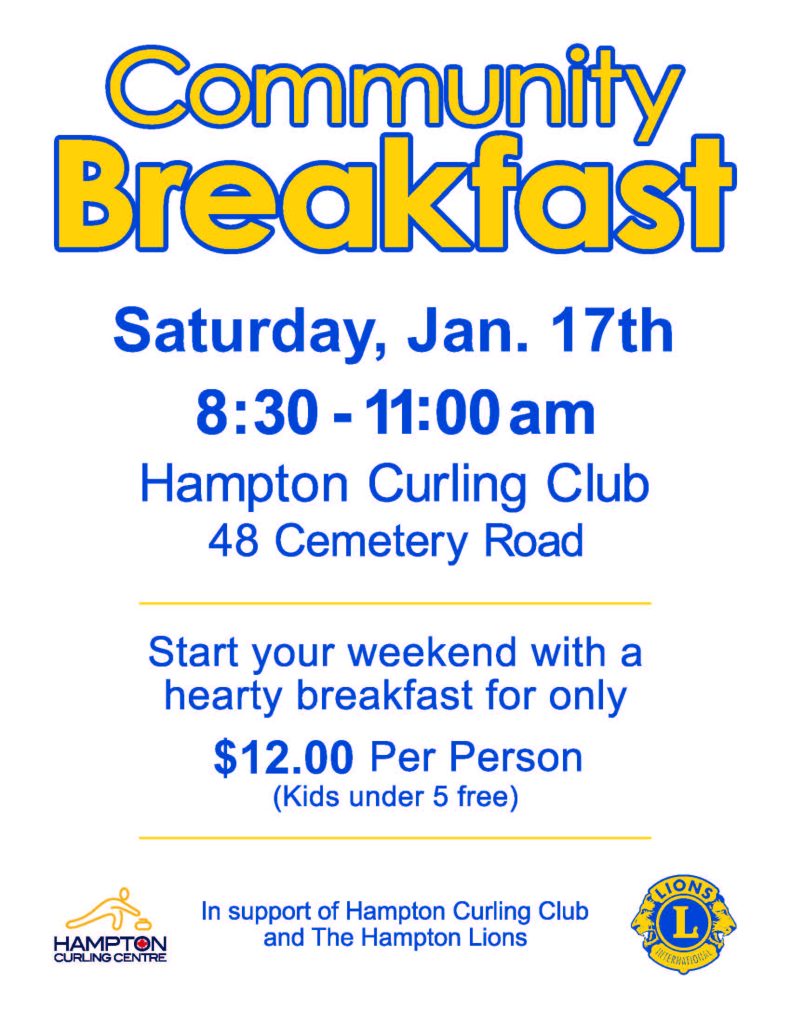 Start your Saturday morning off right with a community breakfast! Visit the Hampton Curling Club with your friends and family from 8:30 AM to 11:00 AM.