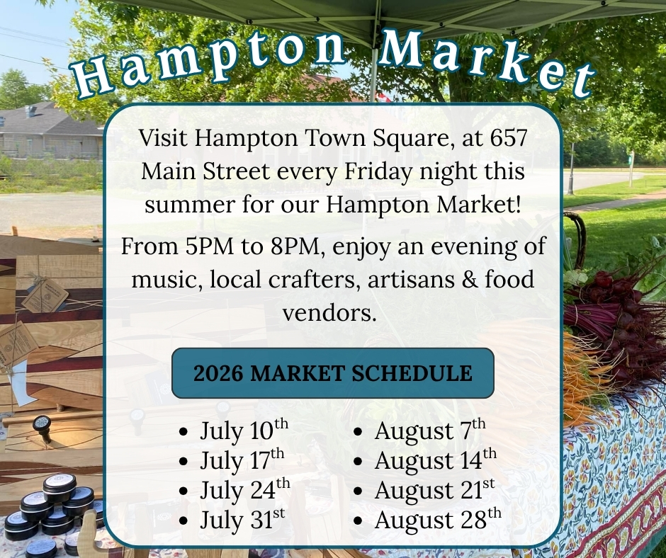 Hampton Town Square 657 Main Street, Hampton, New Brunswick, CanadaWe’re back and gearing up for an exciting 2026 Hampton Market season, featuring a variety of local products, crafts, music, and more in Town Square! The market will return on…